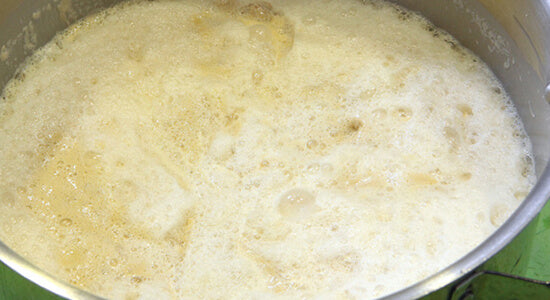 ホップを加えビール特有の苦みと香り(アロマ)を付け煮沸する。