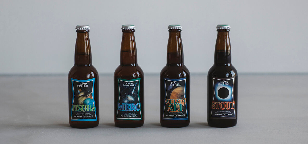 津山ビールのスタンダードは、津山の夜空に広がる満点の星空をイメージした宇宙ラベルシリーズ。ビールタイプは4種類。イラストレーションは手塚治虫「ブラックジャック」、松本清張「砂の器」など様々な装丁画を手がける、西口司郎氏によるものです。